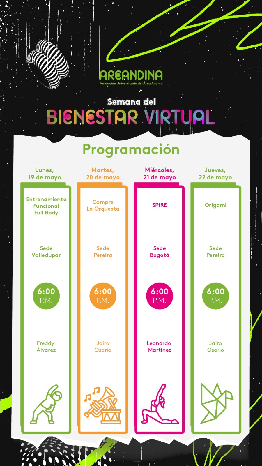 Bienestar universitario quiere invitar a toda la comunidad virtual a que vivan y se conecten a la semana del Bienestar Virtual, que se realizará del 19 al 22 de Mayo , te esperamos con buen contenido, talleres, charlas, concursos y muchos premios: